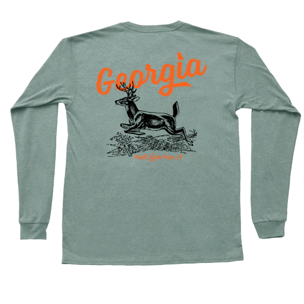 The Peach State Pride cotton long sleeve pocket t-shirt with a classic fit featuring Classic Deer with Georgia Script.