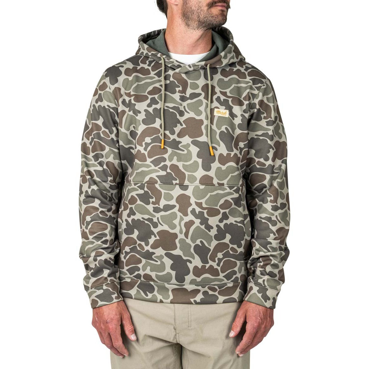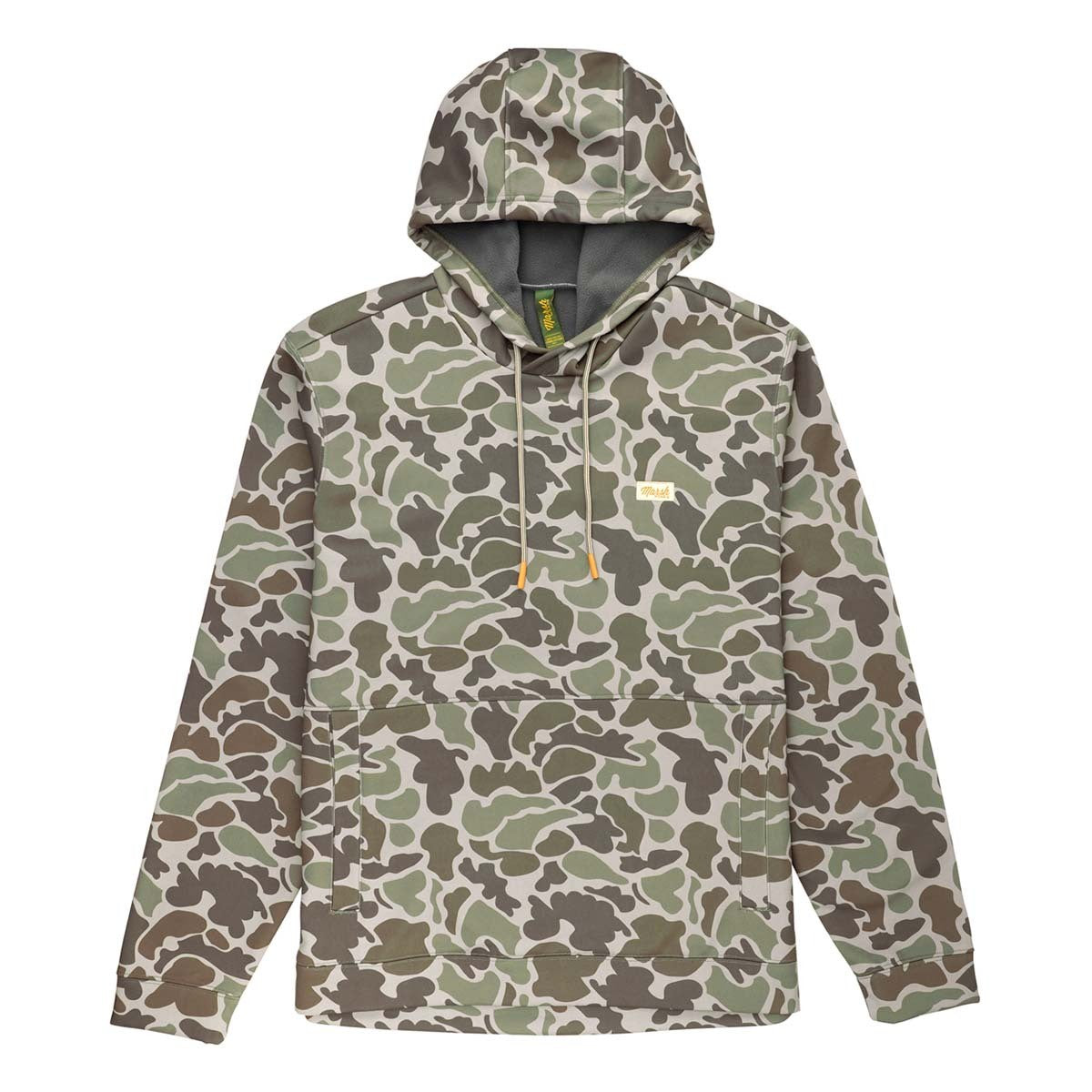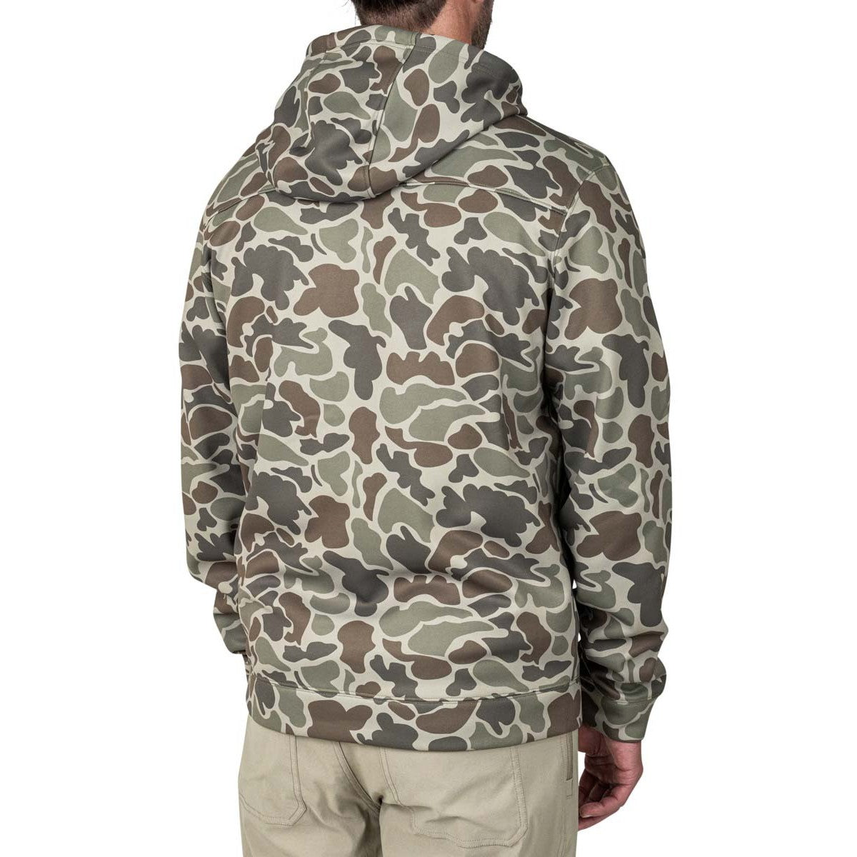 This hoodie is made of a unique bonded micro fleece fabric with a DWR finish that makes for the perfect layering piece for when the temps drop low and the perfect jacket to toss on for cold runs out to the flats or blind.