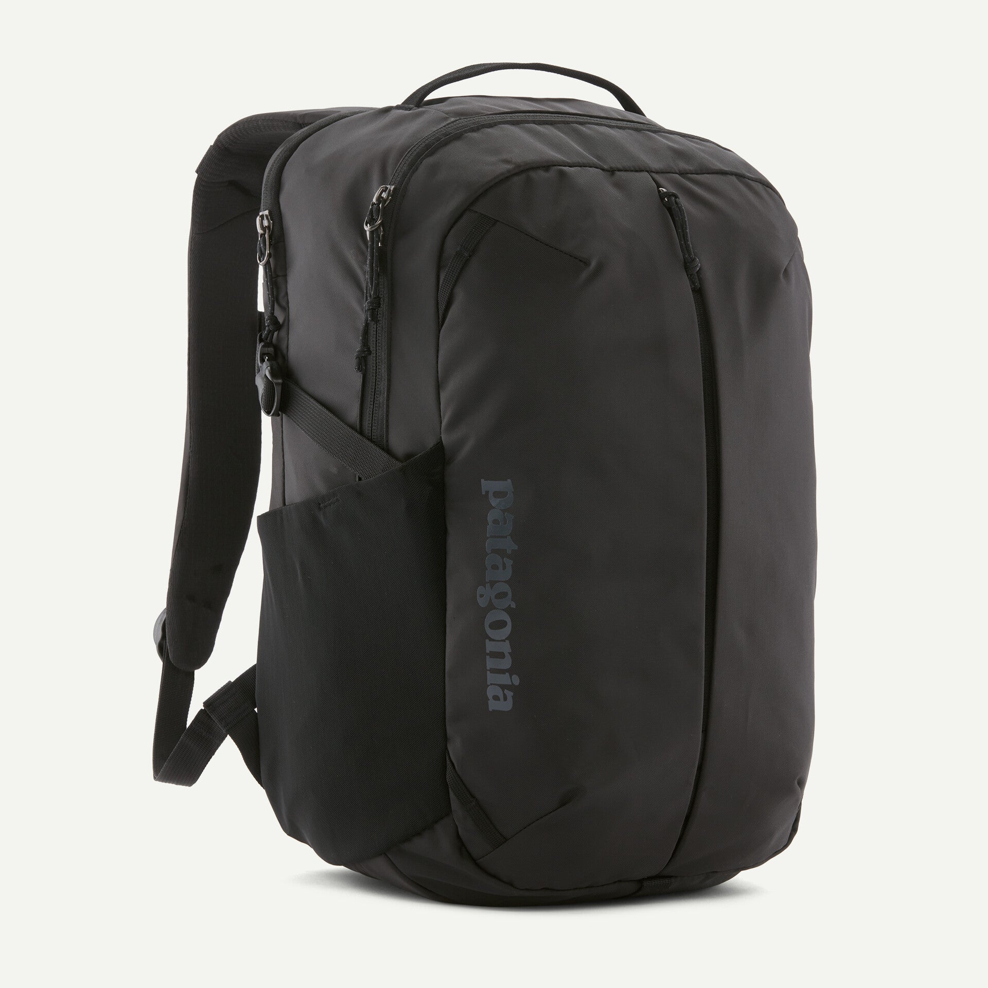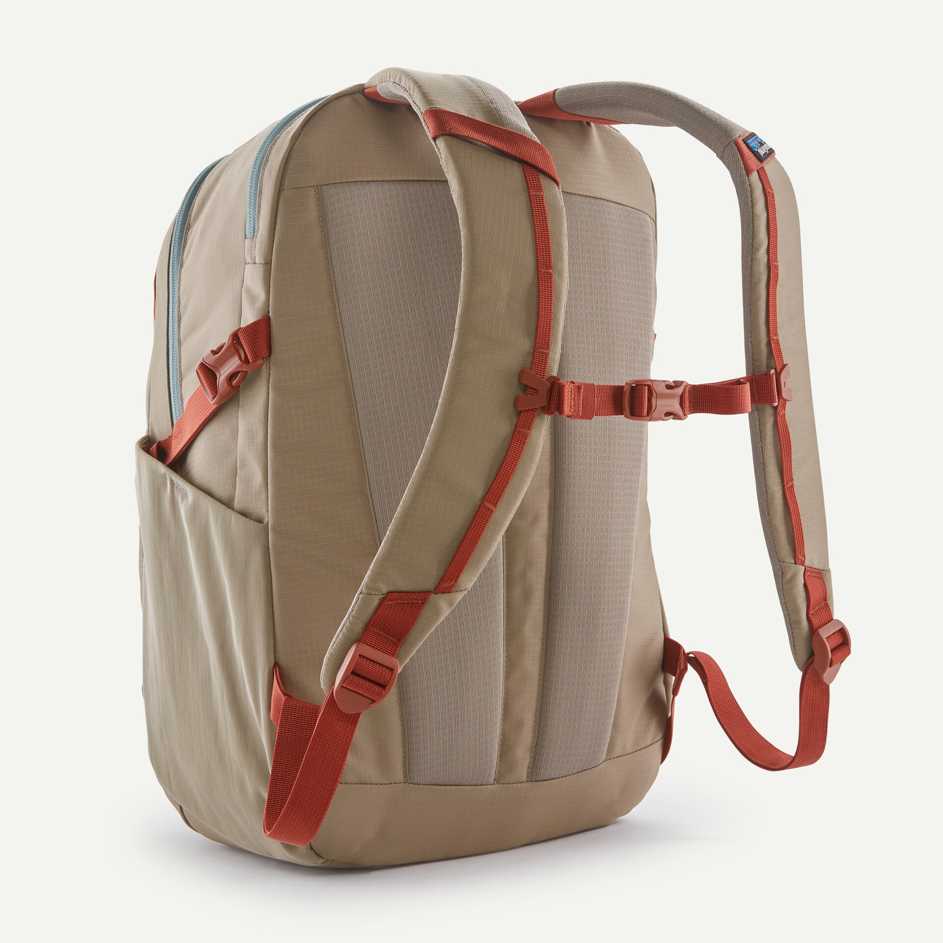 To resist light moisture, this 26-liter pack is treated with a durable water repellent (DWR) finish made without intentionally added PFAS; all fabrics are 100% recycled except the stretchy mesh for the side pockets, which is a 72% recycled nylon/28% spandex blend