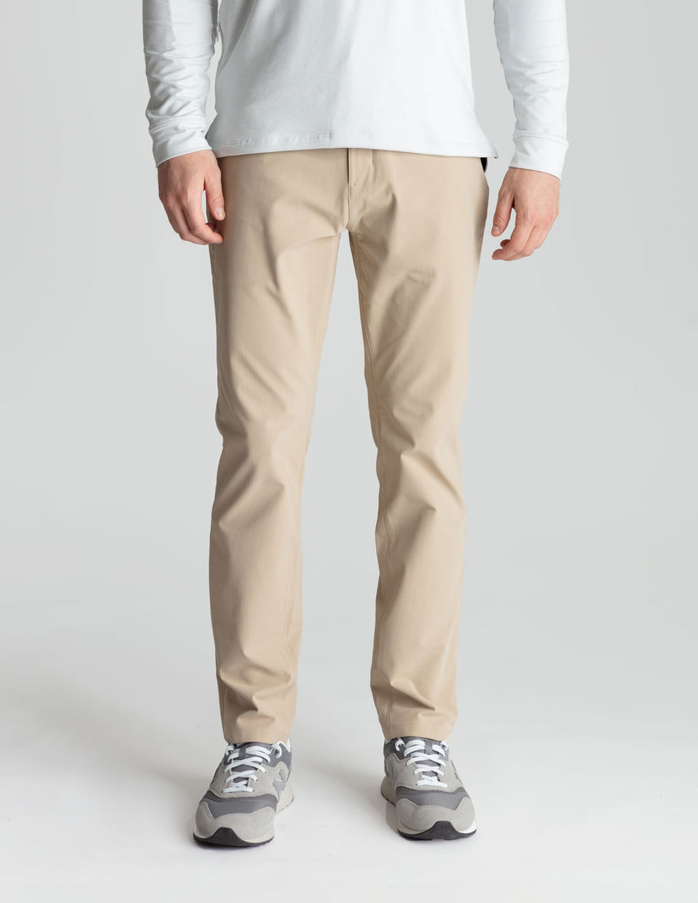 The Flex 5-Pocket Pants have a slim-straight fit. They are not as slim as our stretch khakis. The model is 6'1", weighs 190 lbs, and is wearing size 32x32 and has well-defined legs. Buy these pants if you prefer a relaxed yet tailored fit.